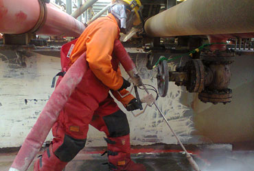 Aqua blasting is the method, by which a high pressure stream of water (450 bar or more) is used to remove old paint, rust, rubber, chemicals, or other heavy build up without causing damage to the surface below it. This method is perfect for internal and external surfaces because the spray gun operator is able to access those "hard to reach" areas (such as pipelines). |